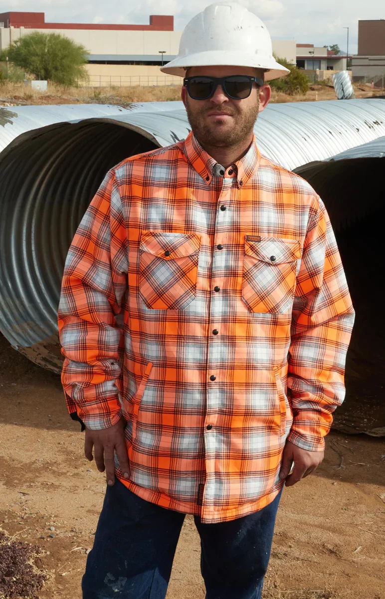 The Guardian is the perfect hi-vis work & riding jacket! Designed for those that work hard and play hard. One side features a black, rain-resistant shell with chest pockets, hand pockets and reflective diamond stitching for extra visibility. The other side is our customer favorite flannel, but in a hi-visĀ orange with UV reflective properties.